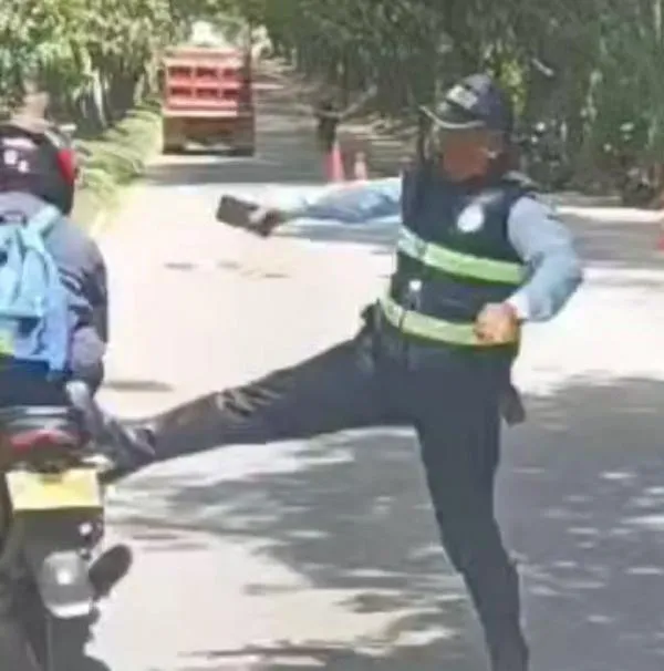 Un nuevo caso de posible abuso de autoridad ha causado rechazo y indignación en Santander. En Girón, un agente de tránsito fue captado en video, cuando en medio de un retén de manera violenta y peligrosa lanza una patada a un motociclista que intentaba evadir un retén.